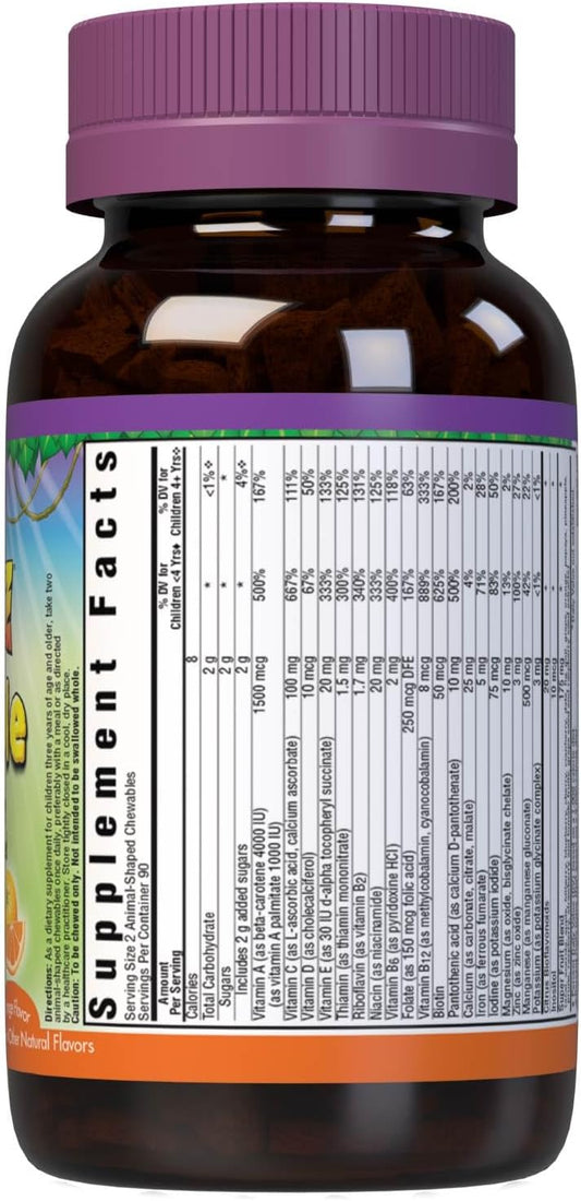 Bluebonnet Nutrition Rainforest Animalz Kids Multivitamin Chewable Tablets - Whole Food Based, Vitamin C, D3, Iron - 180 Tablets, Orange Flavor - Gluten Free, Milk Free, Kosher