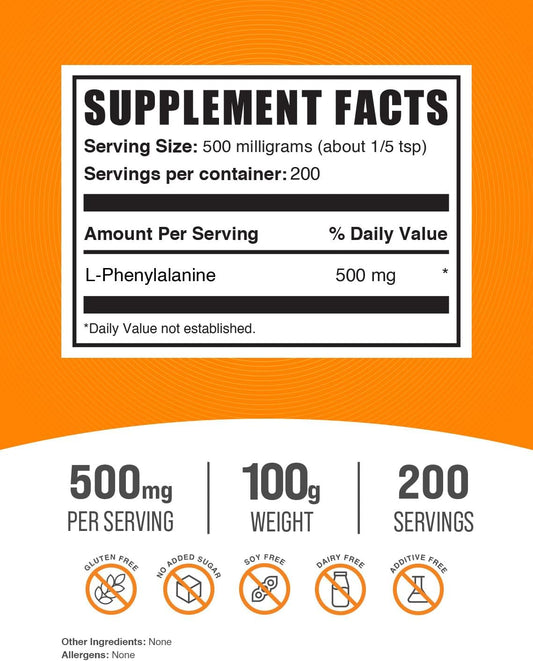BulkSupplements.com L-Phenylalanine Powder - 500mg Amino Acid Supplement, Gluten Free - 100g (3.5 oz) Pack of 1