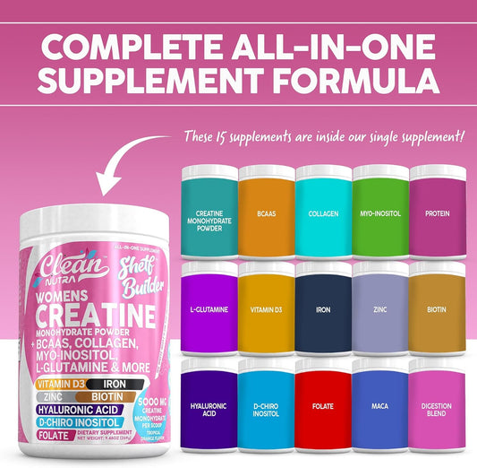 Women's Clean Nutraceuticals Creatine Supplement with BCAAs, Myo-Inositol, Collagen, Biotin, and More for Digestion and Muscle Building