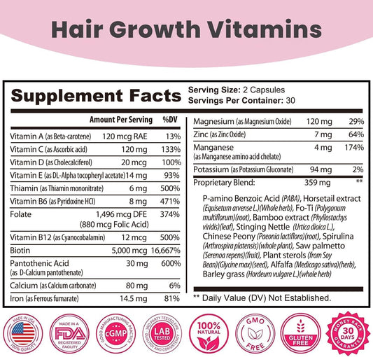 Women's Hair Skin and Nails Vitamins - USA Made Biotin Supplement for Hair Growth - DHT Blocker - Non-GMO, Gluten Free - 1 Month Supply - 5000MCG