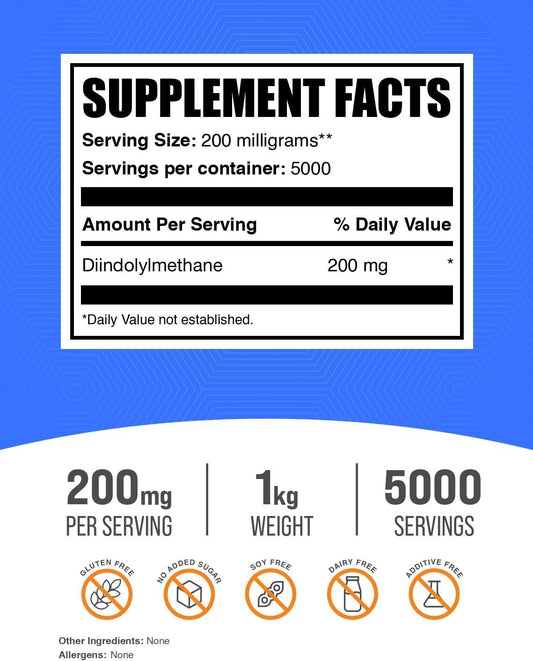 BulkSupplements.com Diindolylmethane (DIM) Powder - 200mg per Serving, Gluten Free Supplement for Men & Women - 1kg (2.2 lbs) Pack of 1