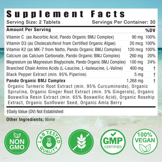 PANDO Ultimate Mobility Supplement for Bone, Muscle, and Joint Support with Turmeric, Magnesium, Vitamins C, D3, K2, Calcium, BCAAs, Organic Spirulina, Ginger, and Boswellia - 60 Vegan Tablets
