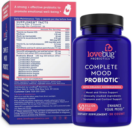 Lovebug Complete Mood Probiotic with 10 Clinically Studied Strains, Ashwagandha for Cortisol & Serotonin Support | Natural Energy & Stress Defense | 30 Count