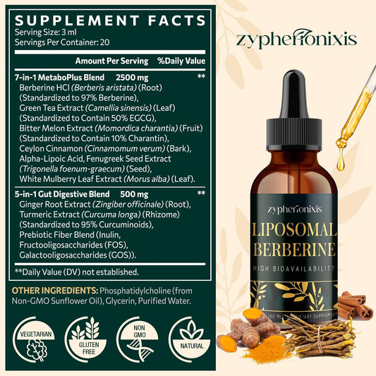 Organic Liposomal Berberine Drops Supplement 3000mg - High Absorption AMPK Activator with Ceylon Cinnamon & Ginger for Immune & Digestion - 2 fl oz