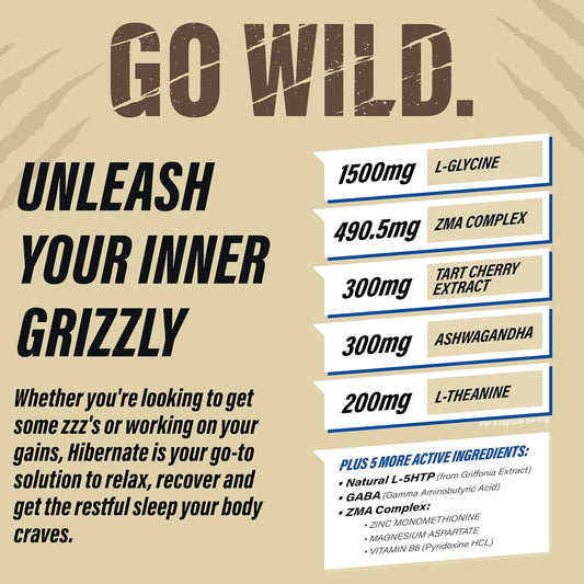 Grizzly Hibernate Sleep Supplement for Post-Workout Growth & Muscle Recovery - Ashwagandha, L-Theanine, GABA, 5HTP, Magnesium, Zinc - 120 Count
