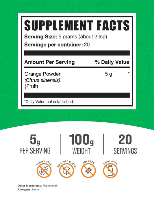 BulkSupplements.com Orange Fruit Powder - Nutrient-Rich Orange Supplement Powder, Gluten Free, 5g per Serving, 100g (3.5 oz) Pack