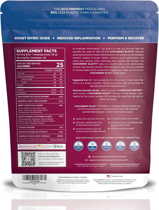 ChocoBerry Blast Superfood Powder - Adaptogenic SuperBerry Smoothie Booster with Beet Juice, Mushrooms, & Polyphenols - Enhances Recovery, Energy, Gut Health, Immunity & Nutrition - Chocolate (480g)