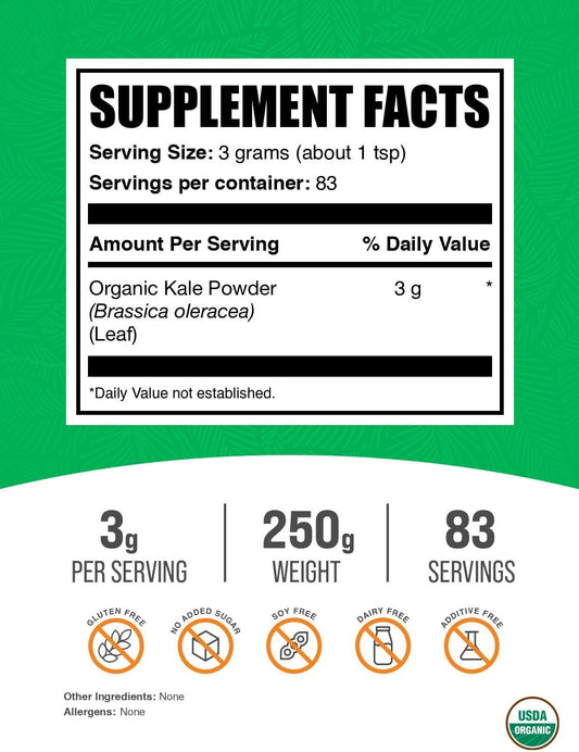 Organic Kale Powder - Superfood Greens Powder, Vegan & Gluten Free - 250g (8.8 oz) Pack of 1 - BulkSupplements