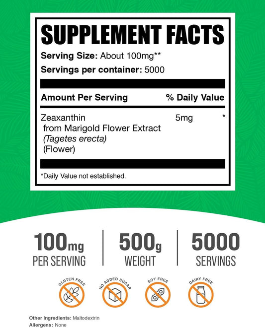 BulkSupplements.com Zeaxanthin Powder - Marigold Flower Extract, Gluten Free, 100mg (5mg Zeaxanthin) - 500g (1.1 lbs) Pack