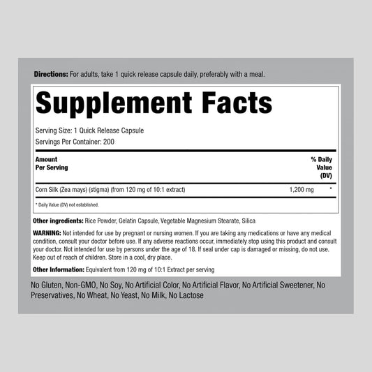 Corn Silk Extract Supplement Capsules 1200mg - 200 Count | Non-GMO, Gluten Free - Piping Rock