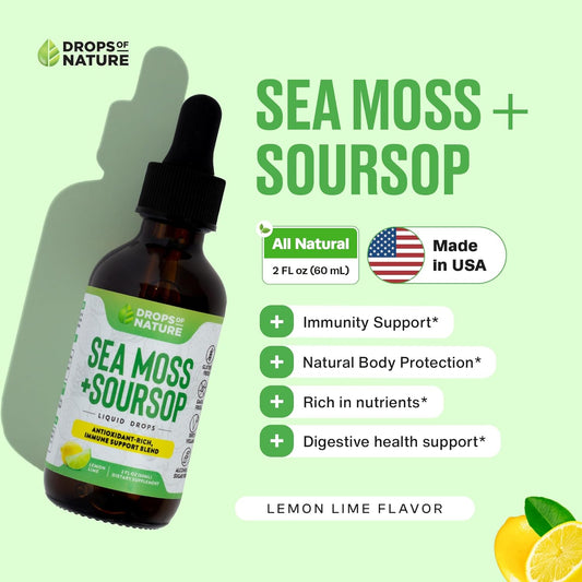 Soursop Liquid Drops with Sea Moss Supplement - Vegan & Highly Concentrated - Hydrating & Immune Support - Lemon Lime Flavor, 60mL