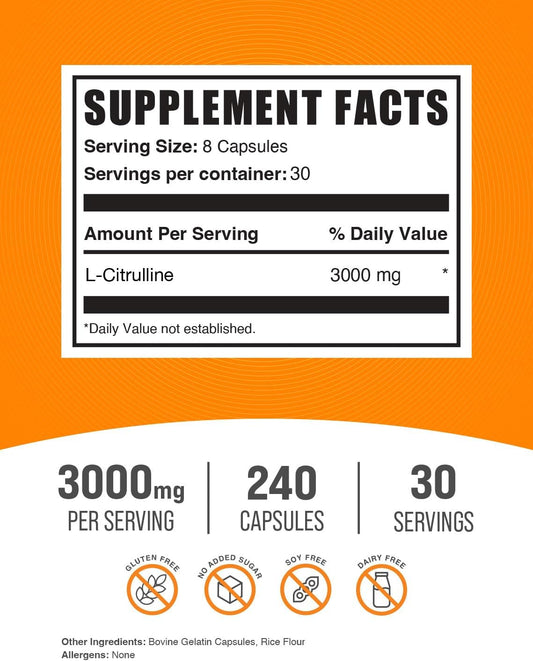 BulkSupplements.com L-Citrulline Capsules - 3000mg Citrulline Supplement, Gluten Free - 240 Capsules
