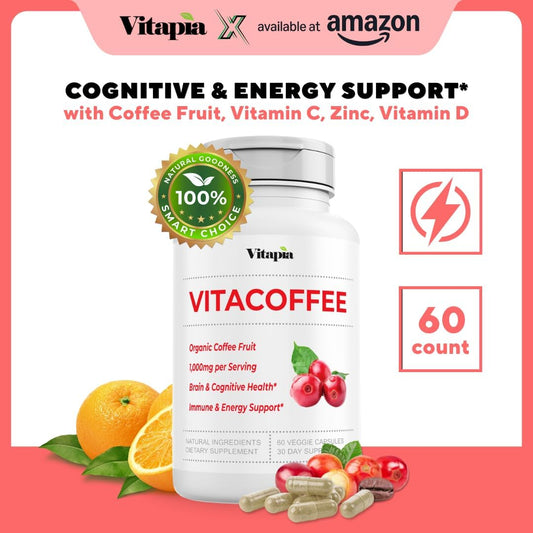 Vitapia Vitacoffee Caffeine Pills with Coffee Fruit, Vitamin C, D, Zinc - Energy and Focus Support - 60 Capsules for Skin, Memory - Non-GMO, Gluten-Free Vegan Supplement