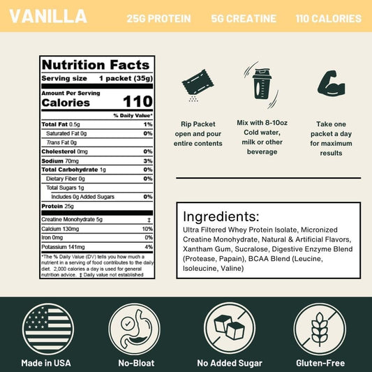 Vanilla Whey Protein Powder with Creatine - 25g Protein, 5g Creatine - Single-Serve Travel Packets - Gluten-Free, No Sugar Added (30-Pack)