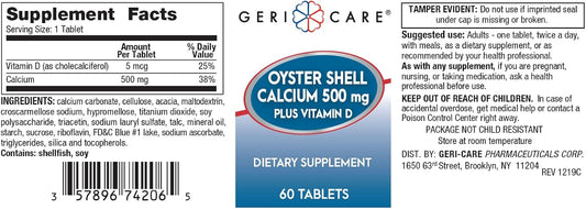 60 Tablets of GeriCare Oyster Shell Calcium 500mg + Vitamin D for Bone Health, Nutritional Support