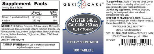 100 Count Gericare Oyster Shell Calcium 250mg and Vitamin D 125IU Tablets for Bone Health