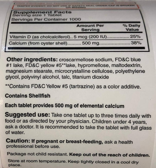 1,000 Tablets AEE Oyster Shell Calcium 500 mg + Vitamin D Supplement for Bone Health