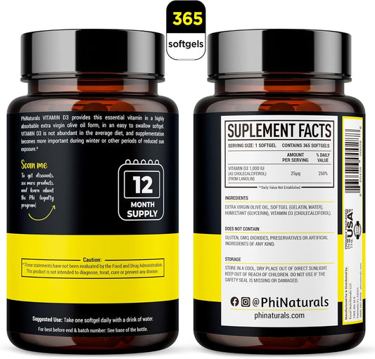 365 Softgel Capsules of PhiNaturals Vitamin D3 1000IU with Olive Oil Base - One Year Supply of Vitamin D Supplement