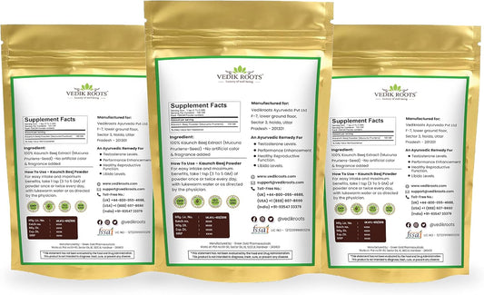 3 Pack VEDIKROOTS Kaunch Beej Powder for Enhanced Strength and Stamina - 100Gm Each
