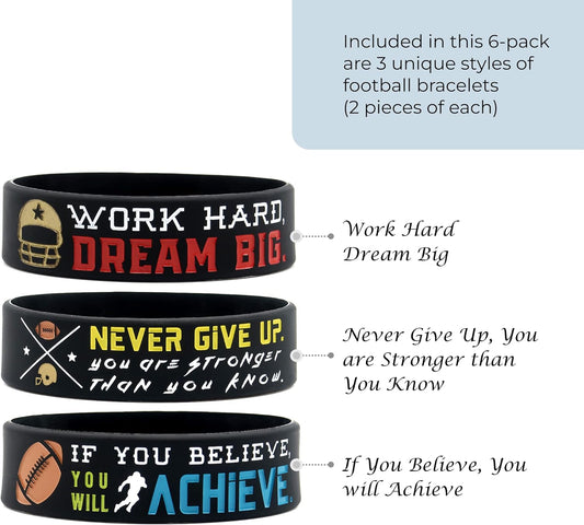 Football Motivational Wristbands Set (6-Pack) with Sports Quotes - Football Gifts for Players - Unisex Accessories for Men, Women, Youth, Teen Girls, Boys - Team Awards & Party Favors