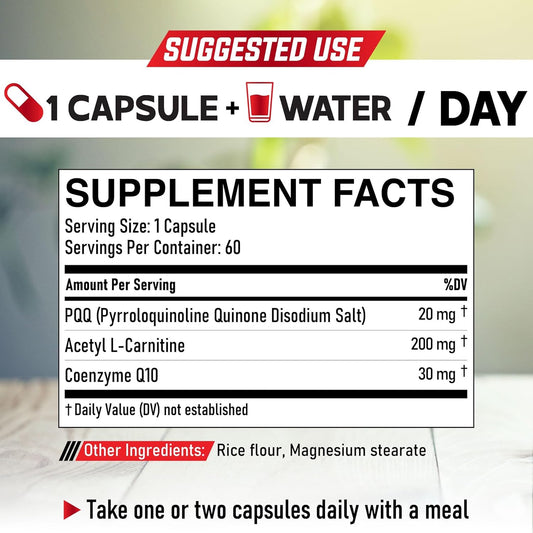 3-in-1 Mitochondrial Supplement with PQQ, CoQ10, and Acetyl L-Carnitine - 60 Capsules for Brain Health and Energy - Gluten-Free, Non-GMO - 2 Month Supply