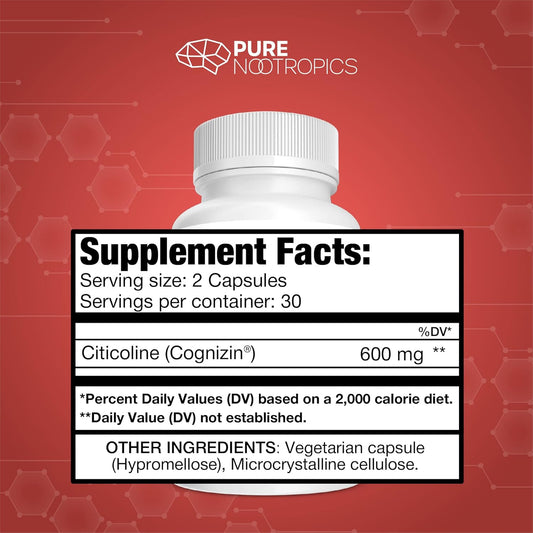 300mg Pure Nootropics CDP Choline Capsules - 60 Veg Caps, Cognitive Support, Memory, Attention, Brain Health, Bioavailable Citicoline