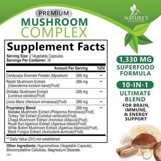 10-in-1 Mushroom Complex Capsules for Memory and Focus - Lions Mane, Turkey Tail, Reishi, Chaga, Cordyceps - Nootropic Brain Supplements - 60 Capsules