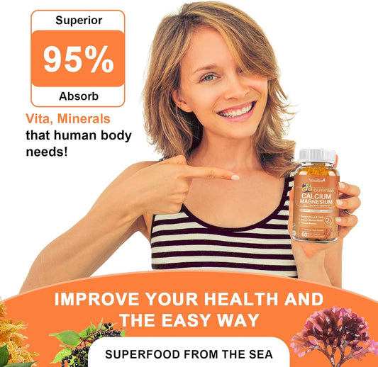 2 Pack Vegan Calcium Magnesium Zinc Gummies with Vitamin D3 & B12, 2:1 Ratio for Bone, Muscle, Mood, Immunity - 120 Orange Flavor Gummies