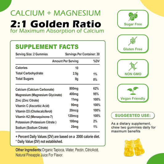 1000mg Calcium + 250mg Magnesium Gummies with Potassium & Zinc - Non-GMO, Sugar Free (60 Count)