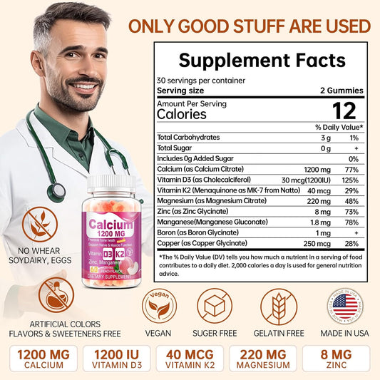 Vitamin D3 K2 Calcium Citrate Gummies with Zinc, Magnesium, Boron, and Copper for Bone and Immune Support - Sugar-Free Chewable Supplement
