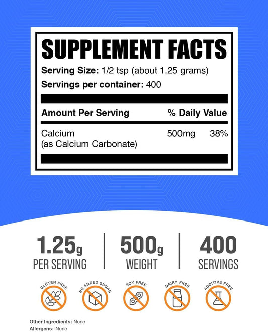 BulkSupplements.com Calcium Carbonate Powder - High-Quality Calcium Supplement, 500mg per Serving, Food Grade, 500g (1.1 lbs) Pack