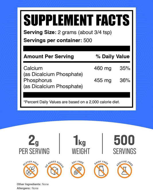 BulkSupplements.com Dicalcium Phosphate Powder - 2000mg per Serving, Unflavored & Gluten Free Calcium Supplement - Ideal Leavening Agent - 1kg (2.2 lbs) Pack