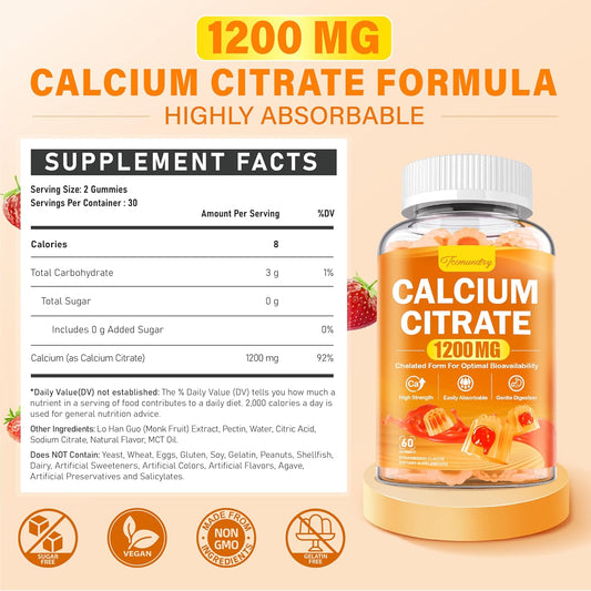Chelated Calcium Citrate Gummies 1200mg for Adults - High Absorption Calcium Supplement - Vegan & Sugar Free - Bone, Muscle & Immune Support