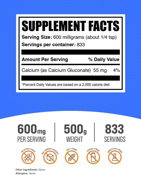 High-Quality Calcium Gluconate Powder Supplement - Gluten-Free, 600mg per Serving, 500g (1.1 lbs) Pack