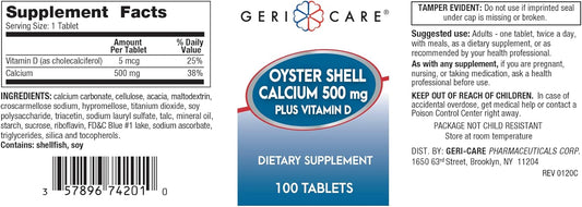 GeriCare Oyster Shell Calcium 500mg + Vitamin D Tablets, 100 Count - Bone Health Supplement