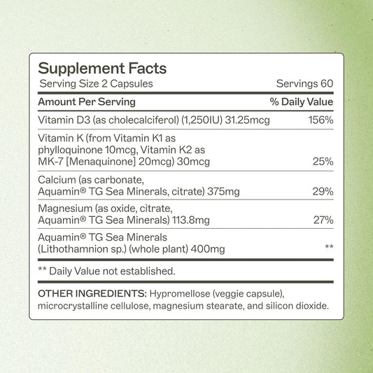 Plant-Based Bone Health Supplement with AlgaeCal Calcium, Magnesium, Vitamin D3, K2, Silicon, Stress Support - 120 Capsules