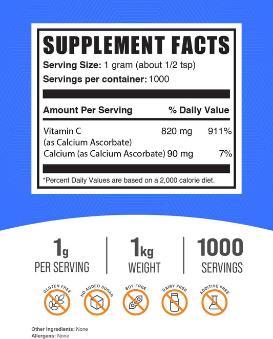 BulkSupplements.com Buffered Vitamin C Calcium Ascorbate Powder - 1000mg per Serving, 1kg - Gluten Free Calcium Supplement Powder