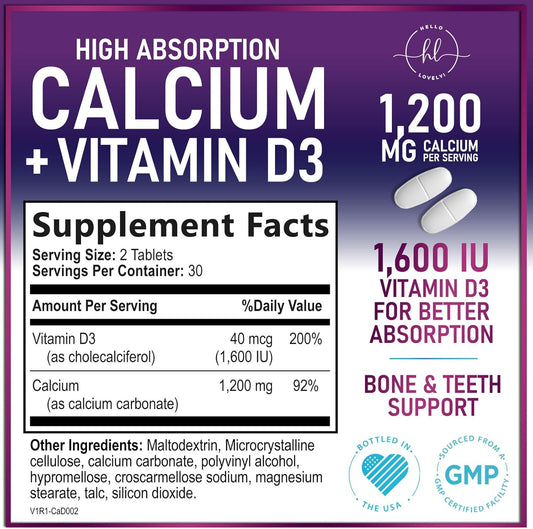 Women's Calcium Supplement with Vitamin D3 for Bone, Teeth, and Immune Support - High Absorbable Premium Calcium Carbonate Tablets - 60 Count