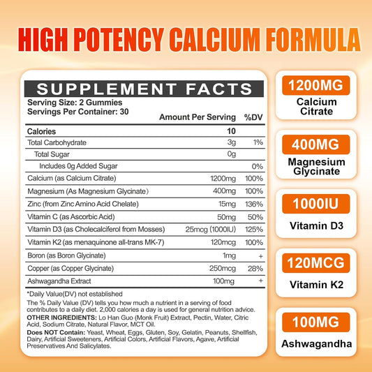High Absorption Maennyliy Calcium 1200 mg Gummies for Adults with Vitamin D3, K2, Magnesium, Zinc, Boron, Copper, and Ashwagandha - Calcium Citrate Supplement for Bone, Muscle, Immune Support