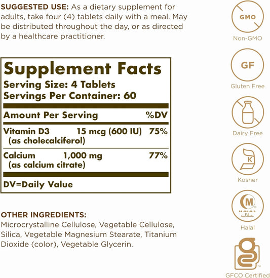 Solgar Calcium Citrate with Vitamin D3 Tablets - Non-GMO, Gluten Free, Kosher, Halal - 240 Count