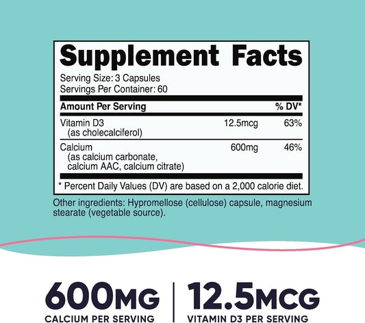 Vegan Calcium and Vitamin D3 Supplement for Women - 180 Capsules, 600mg Calcium, 12.5mcg Vitamin D3 - Non-GMO, Gluten Free