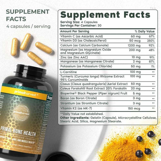 Bone Health Complex with Calcium, Magnesium, Zinc, and More - Primal Harvest Calcium Carbonate Supplement for Men and Women