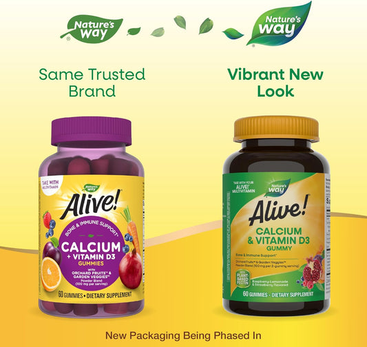 Nature's Way Alive! Daily Calcium & Vitamin D3 Gummies - Bone & Immune Support - Strawberry & Raspberry-Lemonade Flavored - 60 Gummies