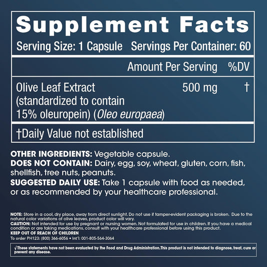 500mg Olive Leaf Extract with 15% Oleuropein - 60 Vegetarian Capsules for ProHealth