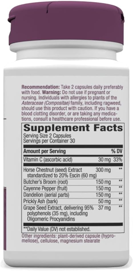 Nature's Way Leg Veins Supplement with Horse Chestnut, Butcher's Broom, Cayenne Pepper, Dandelion, Prickly Ash, Grape Seed & Vitamin C - 60 Vegan Capsules
