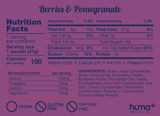 Chia Energy Gel Huma Plus with Double Electrolytes - Berries & Pomegranate Flavor, 24 Pack of Stomach Friendly Real Food Gels