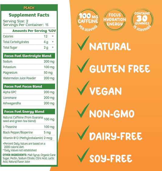 FocusFuel Energy Chews: Peach Flavored 3-in-1 Energy Gummies with 100mg Caffeine, B12, Magnesium, and Ashwagandha - Gluten-Free and All-Natural - 15 Servings