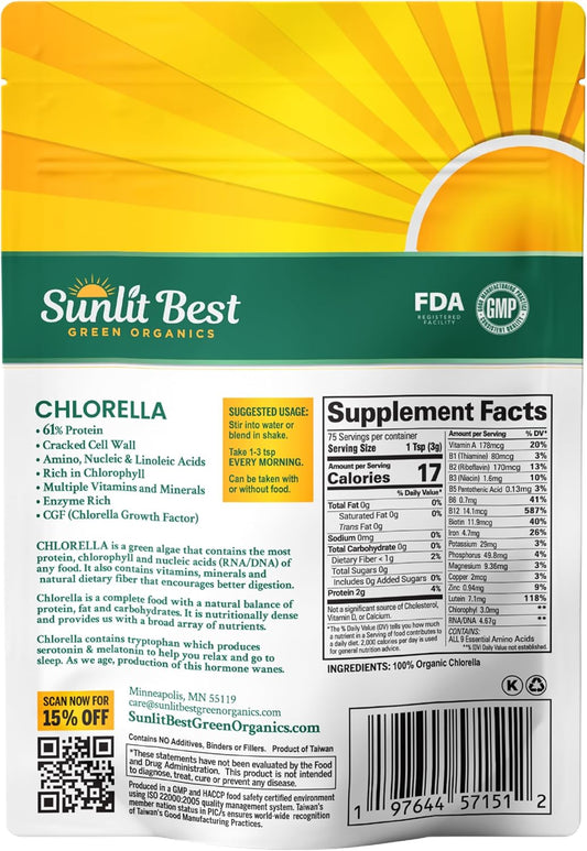 Organic Sunlit Best Chlorella Powder - Vegan Source of Protein & Chlorophyll, Non GMO Superfood Energy Drink for Immune & Gut Health, 8 oz