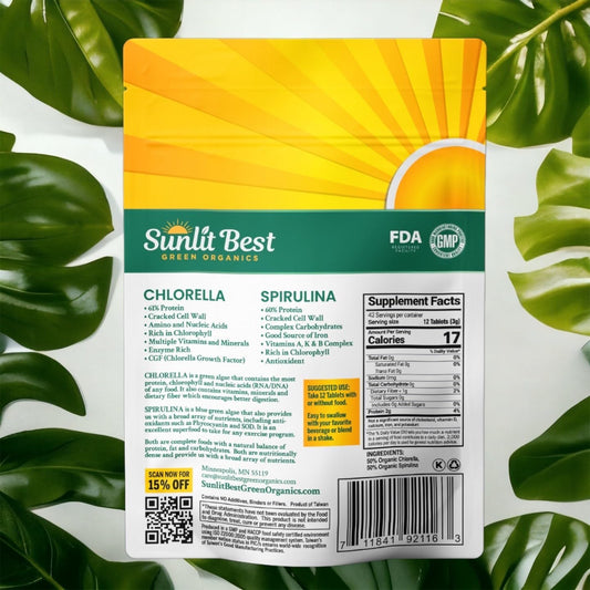 Sunlit Best Green Organics Chlorella Spirulina Tablets - Superfood Supplement with Burst Cell Wall Algae, Chlorophyll & Vegan Protein