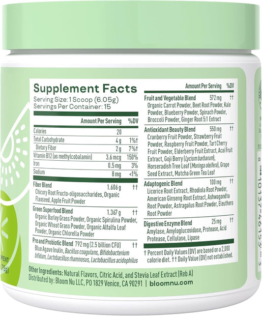 Bloom Nutrition Superfood Greens Powder with Digestive Enzymes, Probiotics, and Prebiotics - Gut Health and Bloating Relief for Women - Chlorella, 15 Servings, Berry Flavor